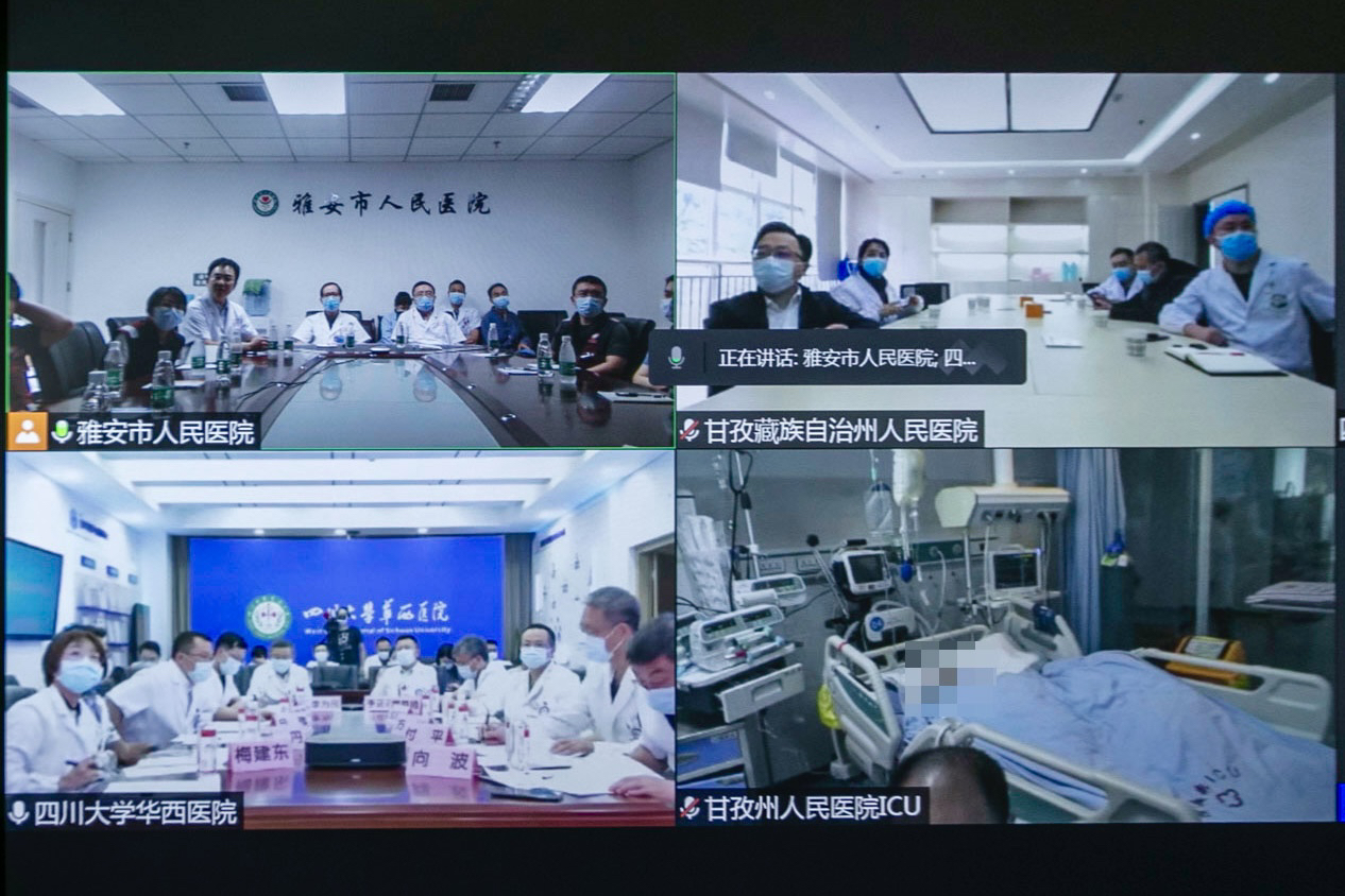 9月6日上午11点30,四川大学华西医院紧急连线雅安市人民医院、甘孜州人民医院,进行9.5泸定地震重症伤员的5G远程会诊。