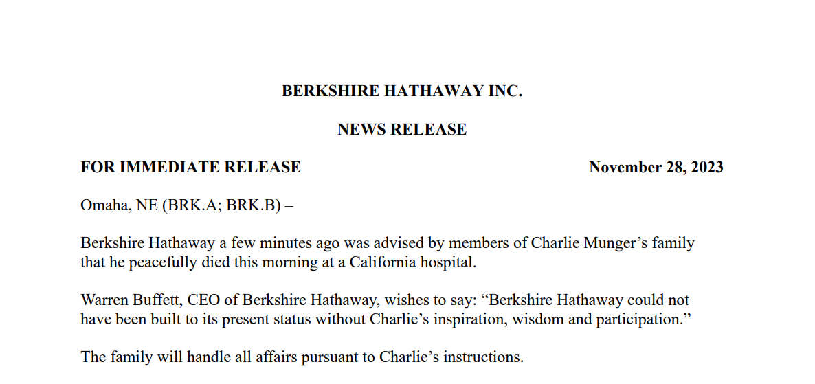 当地时间2023年11月28日早上,99岁的伯克希尔·哈撒韦公司(Berkshier Hathaway)董事会副主席查理·芒格(Charlie Munger)在美国加州的一家医院安详离世。