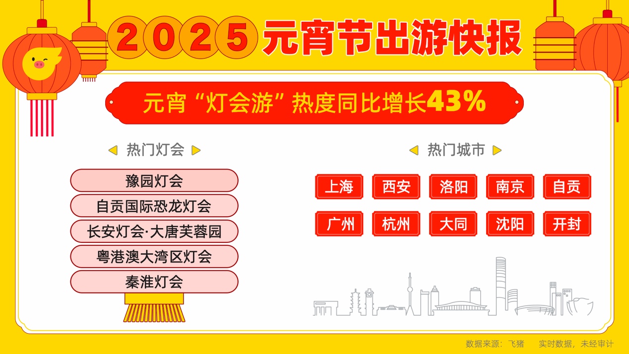 上海、西安、洛阳、南京、自贡、广州、杭州、大同、沈阳、开封等是元宵节出游热门目的地,平台数据显示 ,上述城市酒店预订量平均录得同比双位数增长。