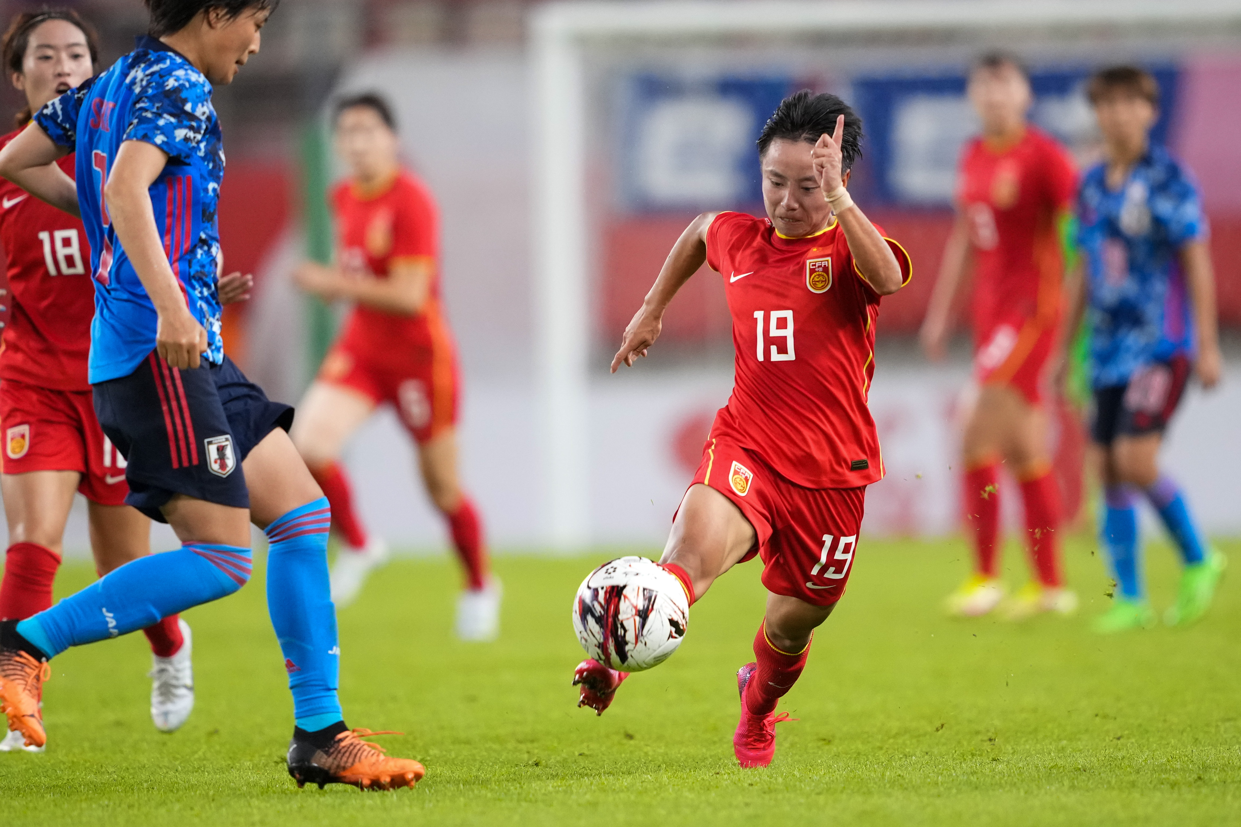 7月26日,中国队球员张琳艳(右)在比赛中带球进攻。当日,在2022年东亚杯女足赛最后一轮比赛中,中国女足以0比0战平日本队,大比分1胜2平获得本届东亚杯足球赛女足亚军,日本队夺得冠军。新华社记者张笑宇摄