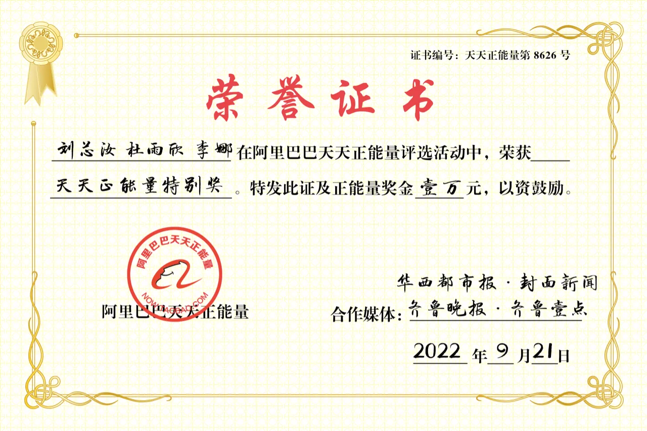9月18日,在由四川德阳开往山东济南西的G1832列车上,3名返乡退伍女兵紧急救人。21日,阿里巴巴天天正能量联合华西都市报·封面新闻、齐鲁晚报·齐鲁壹点为刘芯汝、杜雨欣、李娜颁发正能量特别奖1万元。