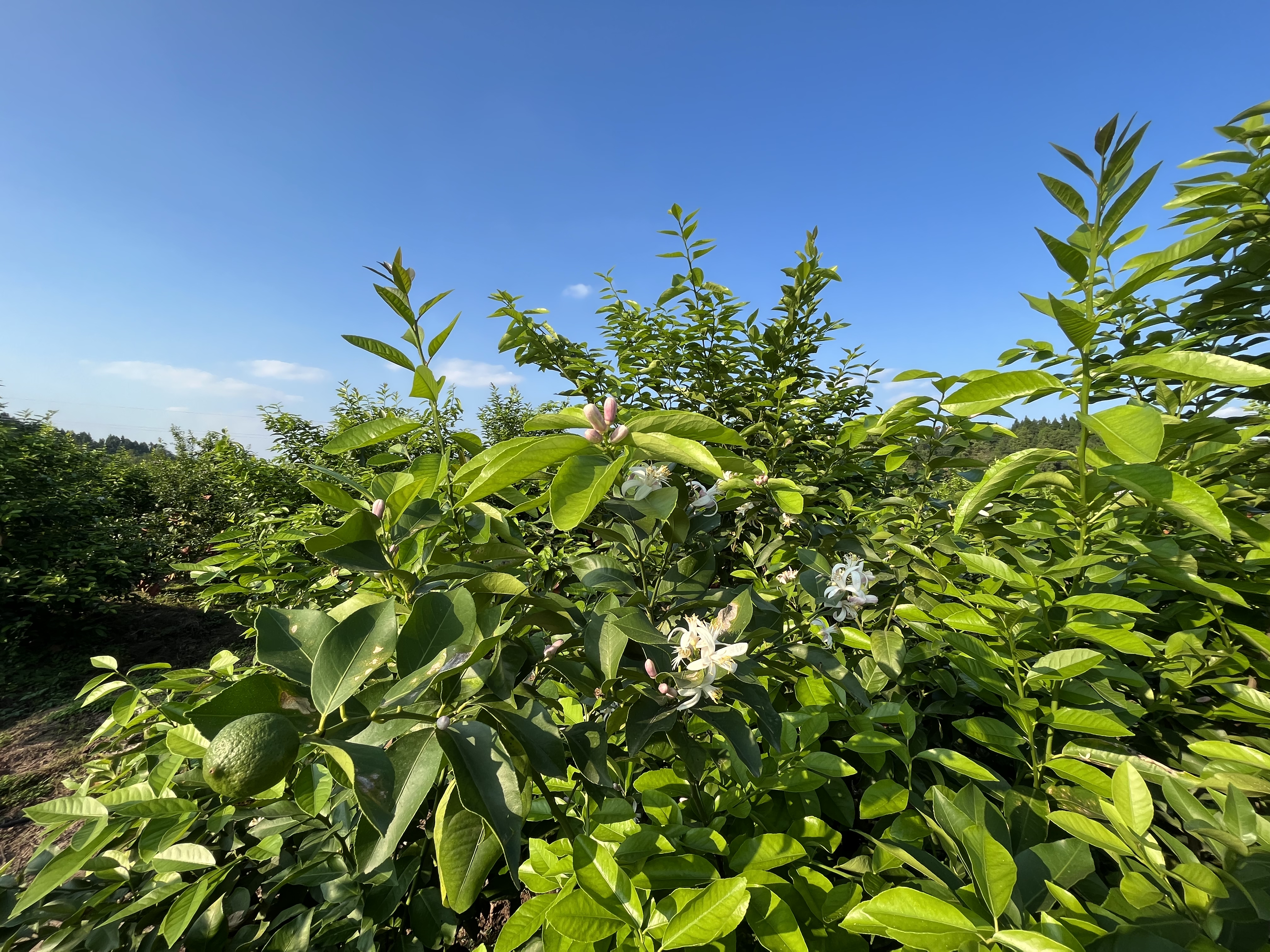 10月8日,四川省资阳市安岳县乾龙镇铁门村,村道两侧的柠檬树上,层层绿叶下,柠檬果和淡紫色的柠檬花相互点缀,形成了花果同树的独特景观。