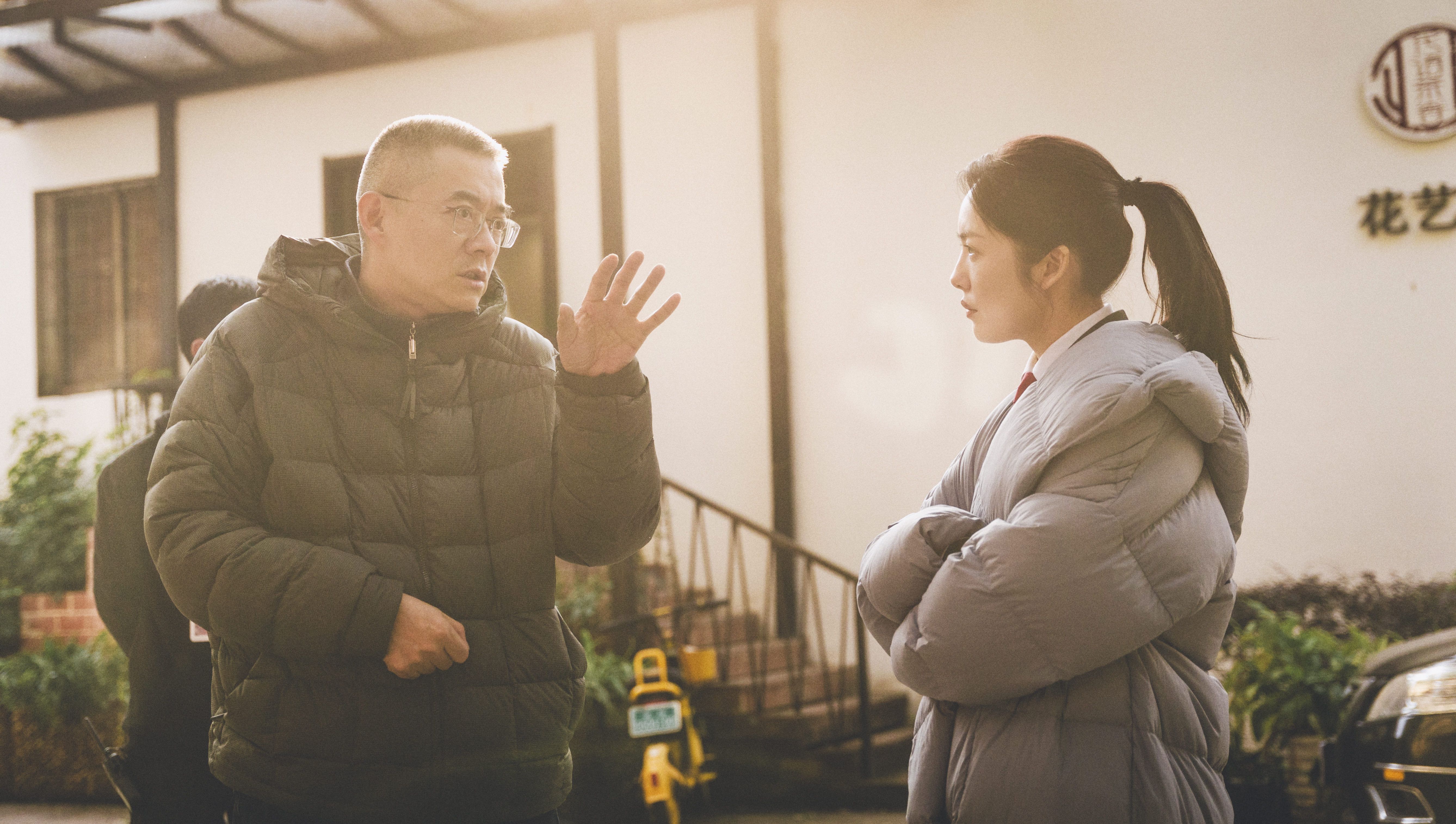 导演刘国彤给演员蔡文静讲解拍摄细节。受访者供图