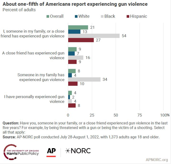 美国芝加哥大学哈里斯公共政策学院和美联社公共事务研究中心联合举行的民意调查发现,有五分之一的受访者表示,过去五年中亲身经历过枪支暴力事件或其身边人经历过枪支暴力事件。图片来源:相关报告截图