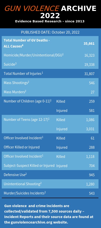 美国“枪支暴力档案”网站数据显示,截至10月20日,2022年美国已发生546起大规模枪击事件,已有超过1300名未成年人死于枪支暴力。图片来源:美国“枪支暴力档案”网站官网截图