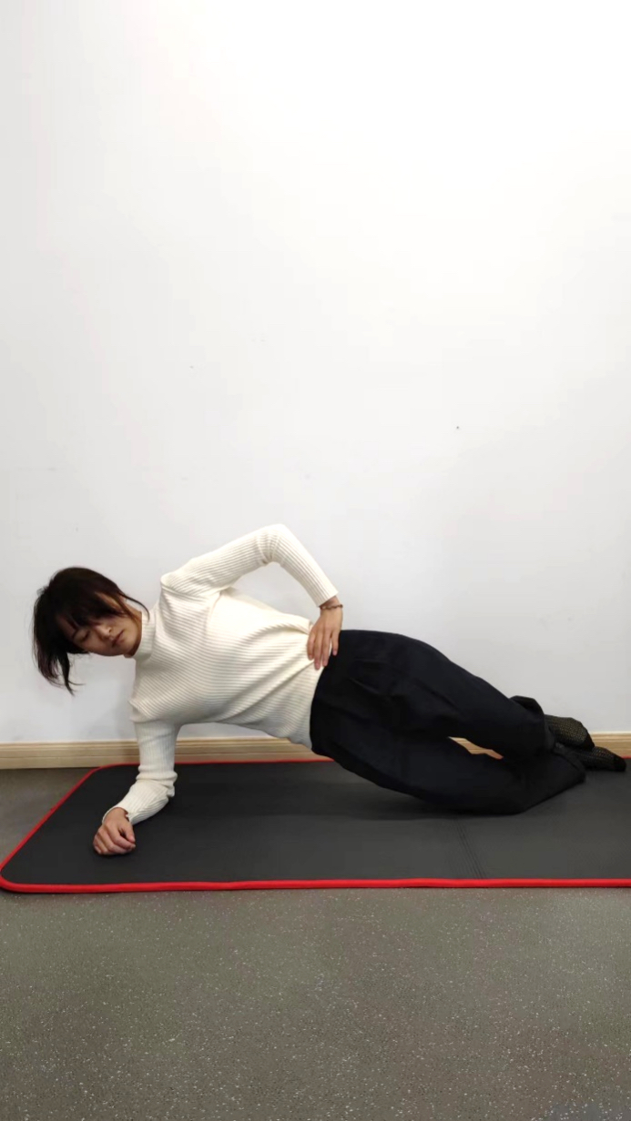 侧躺,用肘部和膝关节将身体支撑起来,躯干与大腿在一条直线上,随后保持60秒。休息10秒,再继续,重复3-5次。