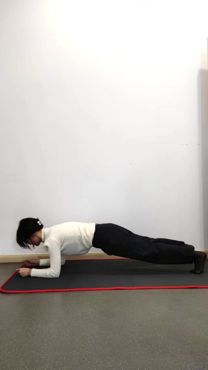 双肘支撑,双脚分开与肩同宽踩稳,深吸一口气,缓慢呼气的同时收紧我们的腰腹大腿肩背,使我们的身体成一条线,呼气的过程中腹部应该是越来越紧绷直至我们慢慢的把气吐完,然后慢慢的下来,重复3-5次。