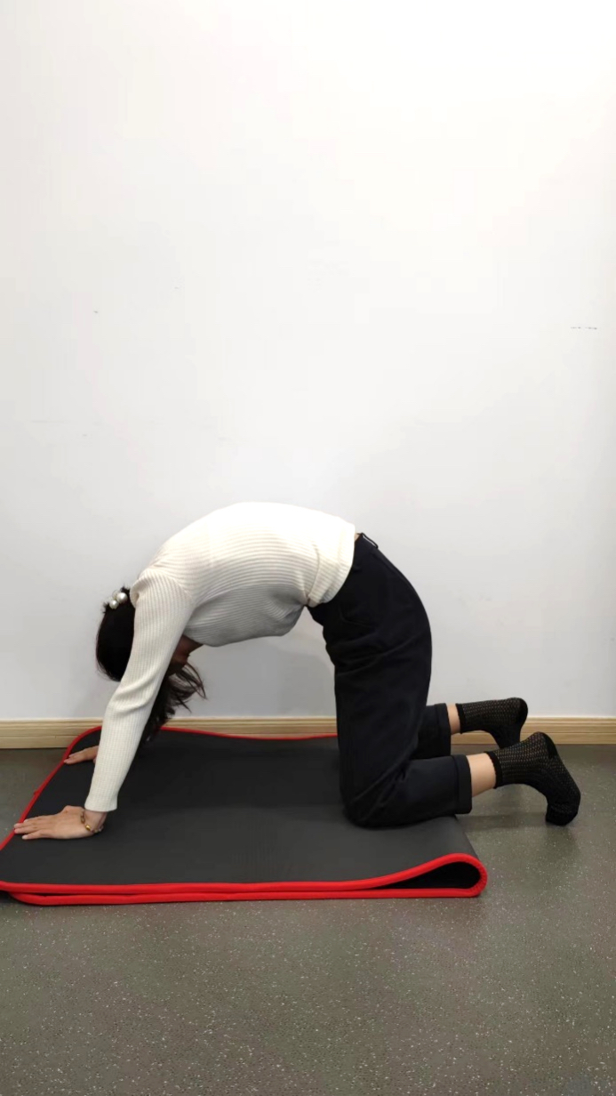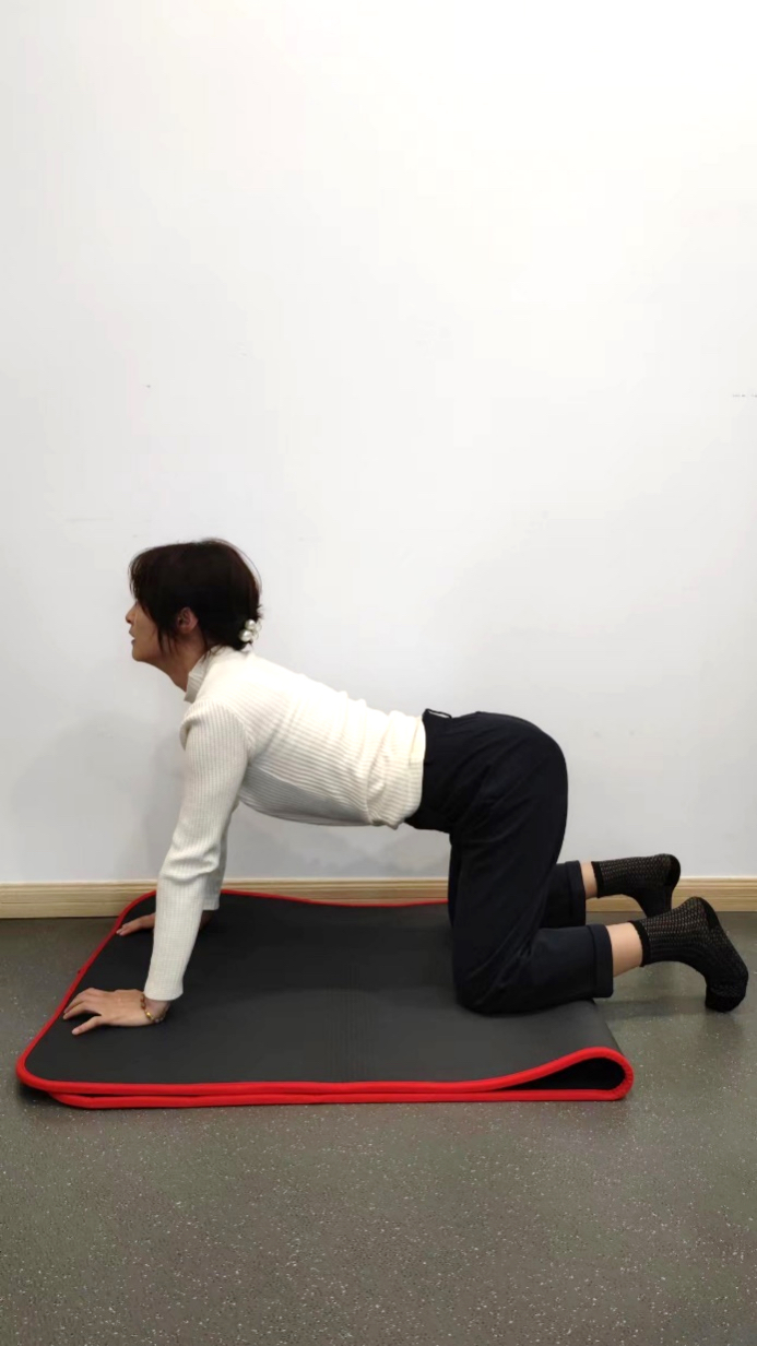 双膝与肩同宽跪于垫上,双手臂伸直支撑身体,缓慢吸气的同时慢慢的塌腰仰头,感受身体前侧肌肉的拉伸放松;然后缓慢呼气的同时慢慢的拱背埋头,感受腰背颈后肌肉的拉伸放松,重复8-10次。