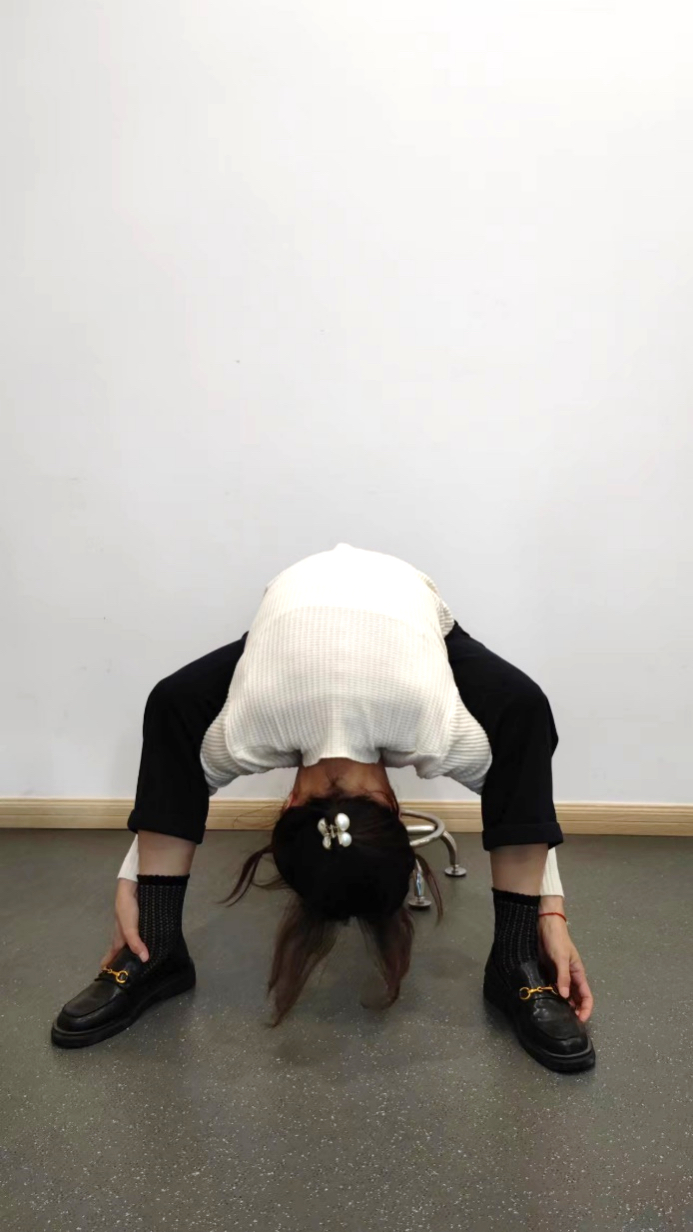 双膝分开坐于凳子边缘(保证凳子稳定),双手从大腿内侧绕处于小腿外侧,双手尽量勾脚背,顺势弯腰向下,缓慢地埋头向后看直至腰背有牵拉的感觉并停留半分钟左右。