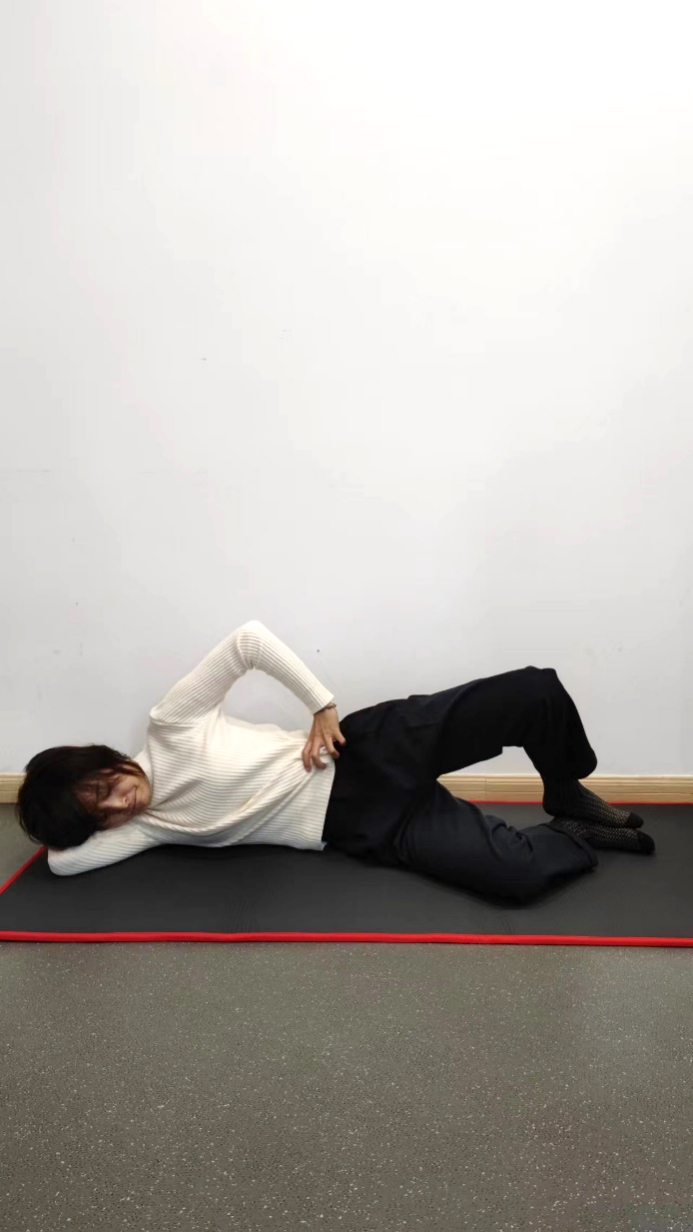 侧躺,髋关节与膝关节屈曲,腹部收紧,背部平整,脚踝贴紧,慢慢地旋转一侧髋关节至最大处,然后缓慢放下,每组8次,共3组。