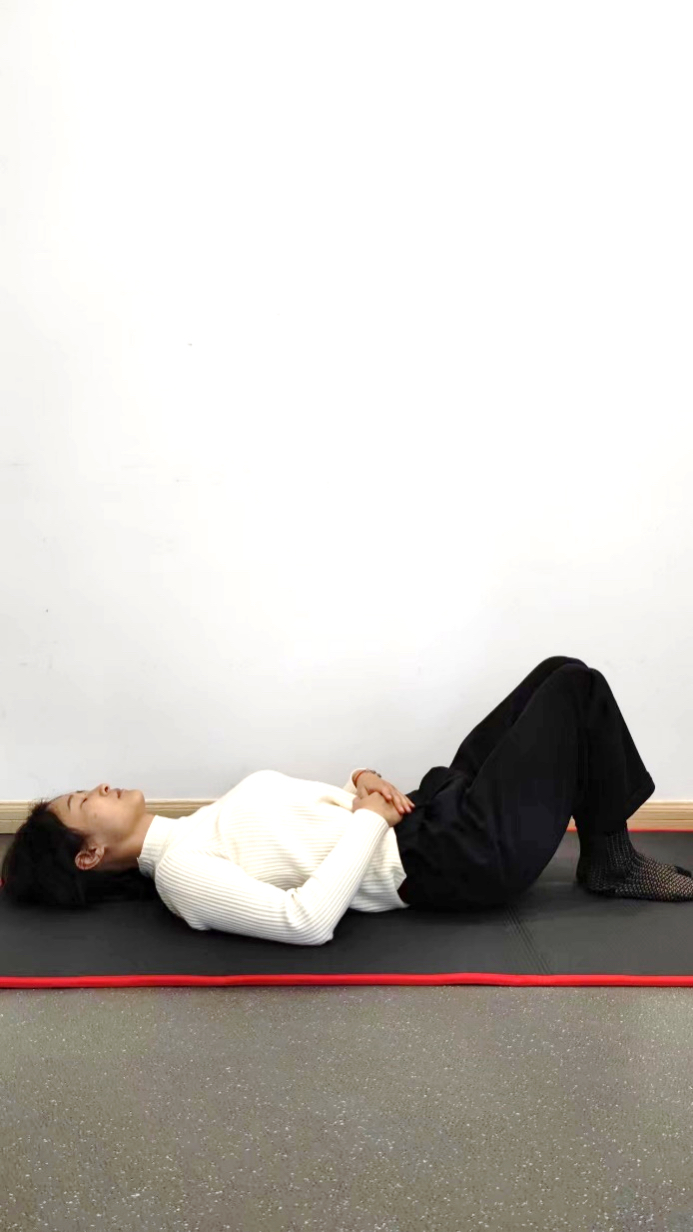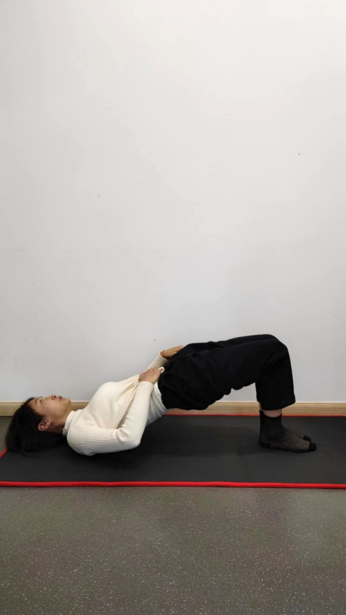 仰躺,双手置于身体两侧,双脚分开与肩同宽,双脚平放地上,使小腿与地面成45°左右夹角,臀部大腿后侧用力使身体抬起至肩髋膝关节在同一线上,保持3-5秒后缓慢放下。每组8次,共3组。