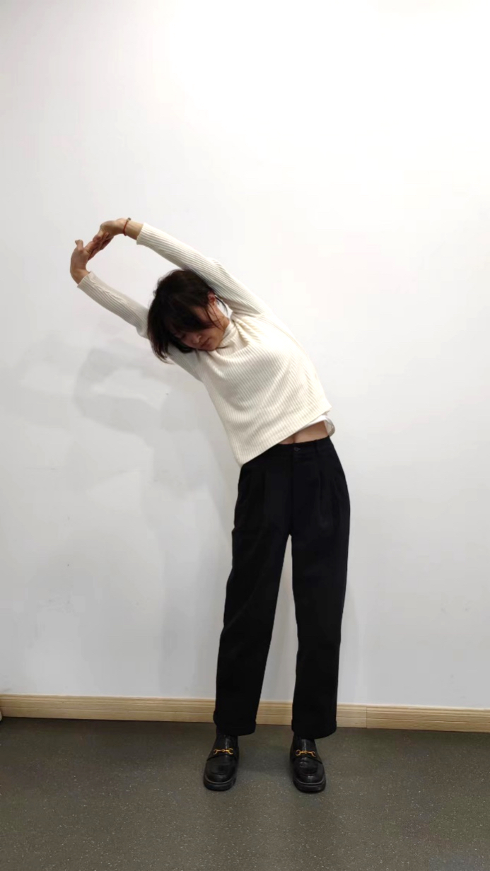 双脚并拢站立,双手交叉高举于头顶,伸直手臂,向一侧稍偏前的方向缓慢的倾倒我们的身体,慢慢地感受腰背部的牵扯,到快不能承受的位置停留半分钟,然后缓慢的放松,再换到对侧重复3到5次,就可以有效地缓解因为腰背肌肉筋膜紧张引起的疼痛不适。
