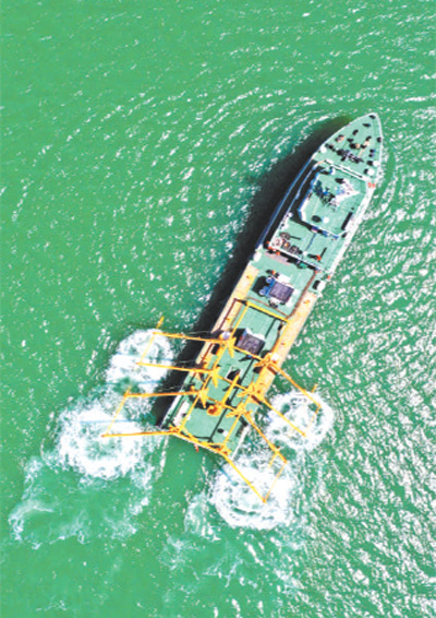 中国石化石油工程地球物理公司胜利分公司在渤海湾实施三维地震勘探采集项目,为油气勘探提供重要依据。图为胜利707气枪震源船在作业。 胡庆明摄(影像中国)