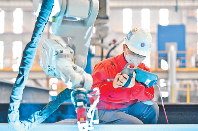 在我国首个海洋油气生产装备智能制造基地——海洋石油工程股份有限公司天津智能化制造基地,工作人员在操作焊接机器人。该基地重点发展油气生产平台及上部模块等海洋工程产品。 新华社记者 赵子硕摄