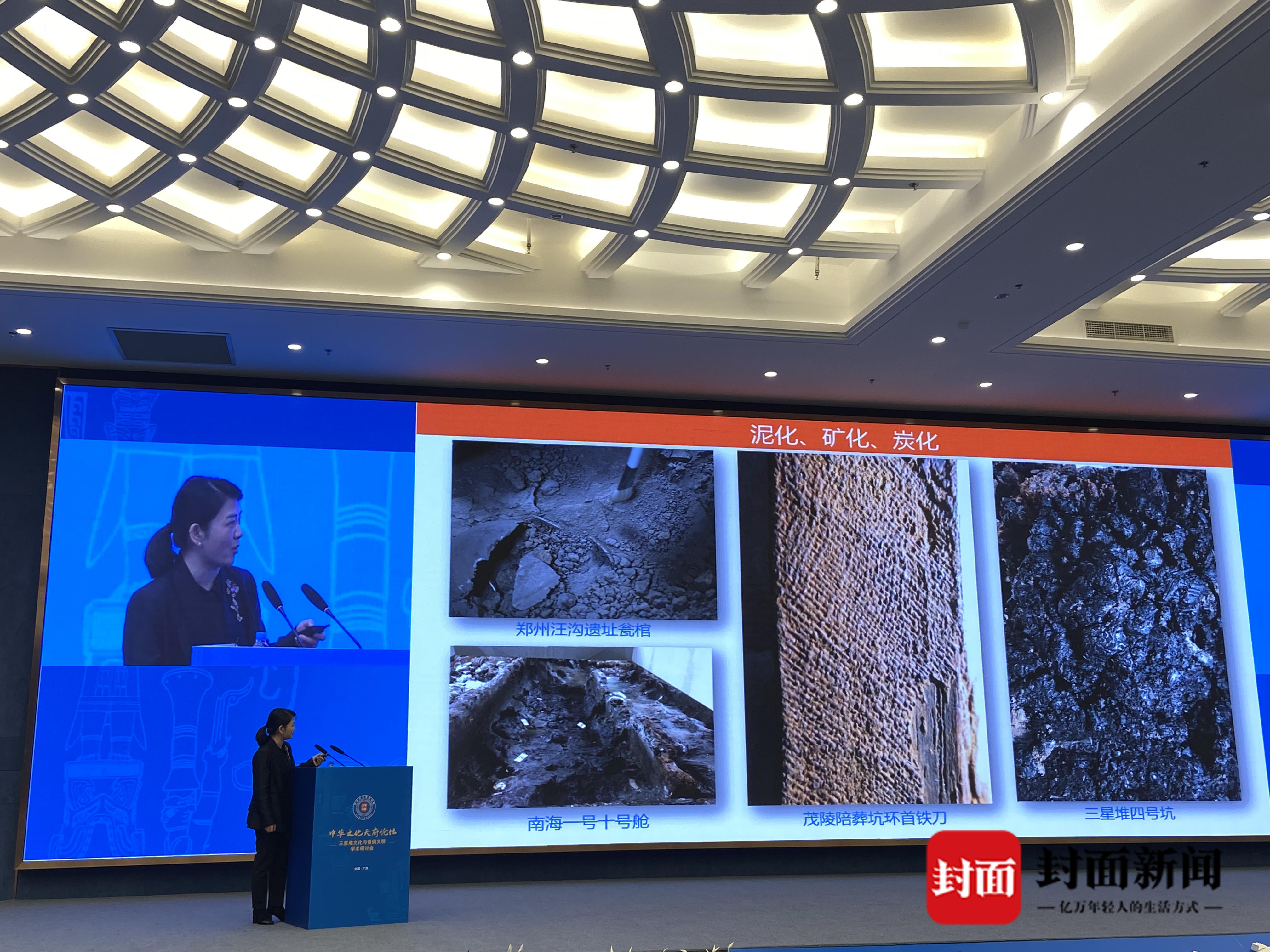 10月29日,三星堆文化与青铜文明学术研讨会将在广汉市举行。论坛上,中国丝绸博物馆副馆长、纺织品文物保护国家文物局重点科研基地主任周旸发表主题演讲,再次向公众分享了三星堆与丝的故事,解密了如何在祭祀坑里发现丝绸,解读了发现丝绸的意义。