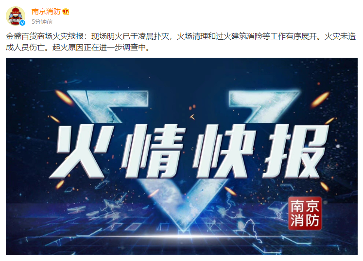 消防通报南京一商场失火:明火已于凌晨扑灭 未造成人员伤亡 央视新闻 2022-10-30 07:37 40755 江苏省南京市金盛百货商场火灾续报:现场明火已于凌晨扑灭,火场清理和过火建筑消险等工作有序展开。火灾未造成人员伤亡。起火原因正在进一步调查中。 评论 0 还没有添加任何评论,快去APP中抢沙发吧! 我要评论