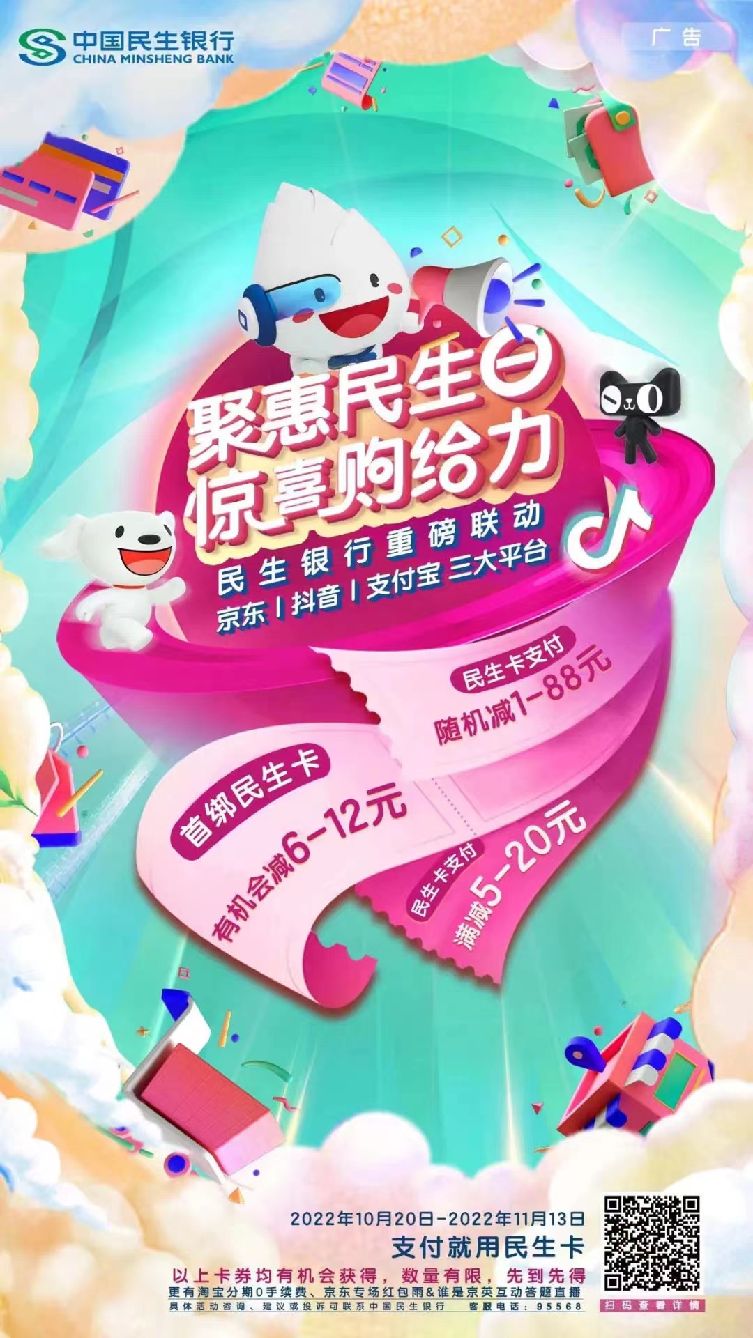 10月20日-11月13日,民生银行携手京东、支付宝、抖音等头部电商平台,联合打造“聚惠民生日”双十一专场优惠活动。