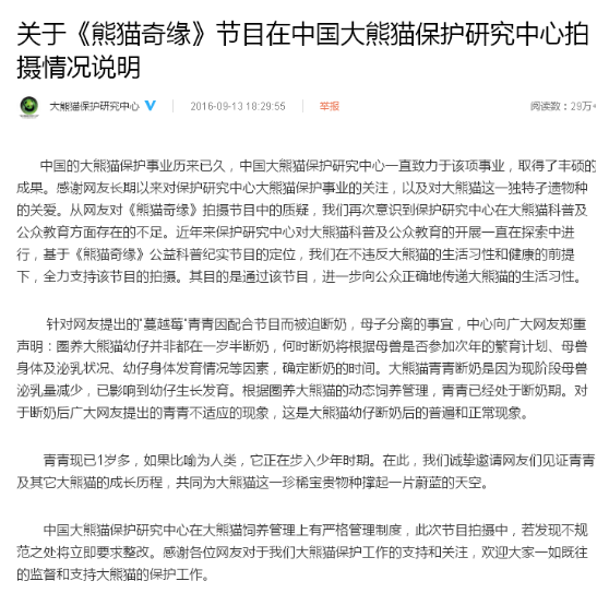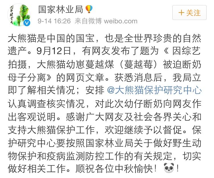 14日下午,国家林业局在其官方网站作出回应:大熊猫是中国的国宝,也是全世界珍贵的自然遗产。9月12日,有网友发布了题为《因综艺拍摄,大熊猫幼崽蔓越煤(蔓越莓)被迫断奶母子分离》的网页文章。获悉消息后,我局立即了解相关情况;安排@大熊猫保护研究中心认真调查核实情况,对此次幼仔断奶向网友作出客观说明。感谢广大网友及社会各界关心和支持大熊猫保护工作,欢迎继续予以督促。保护研究中心要按照国家林业局关于做好野生动物保护和疫病监测防控工作的有关规定,切实做好相关工作。