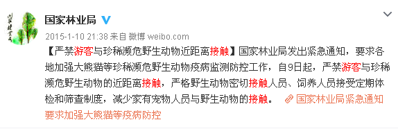 2015年年初,陕西大熊猫大面积遭到犬瘟侵袭,据不完全统计,已有5只大熊猫因感染犬瘟死亡。此后,国家林业局多次在官方微博发出通告,禁止游客与珍稀濒危野生动物接触,减少家有宠物人员与野生动物的接触。