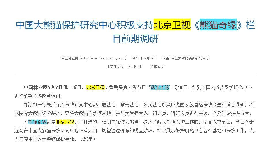 封面新闻记者发现,今年7月7日,中国林业网曾公布了一份《中国大熊猫保护研究中心积极支持北京卫视<熊猫奇缘>栏目前期调研》的文件。文件称,北京卫视大型明星真人秀节目《熊猫奇缘》导演组一行到大熊猫保护研究中心进行前期拍摄踩点调研。节目期望通过偶像的明星效应,结合展示保护研究中心各个基地的保护工作,大力宣传中国的大熊猫保护事业。