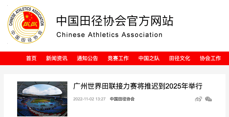 中国田径协会在官网发布通告称,世界田联在与中国田径协会和广州赛事组委会共同商议后达成一致,原定于2023年5月举办的世界田联接力赛推迟到2025年举行,赛事具体日期有待进一步确定。