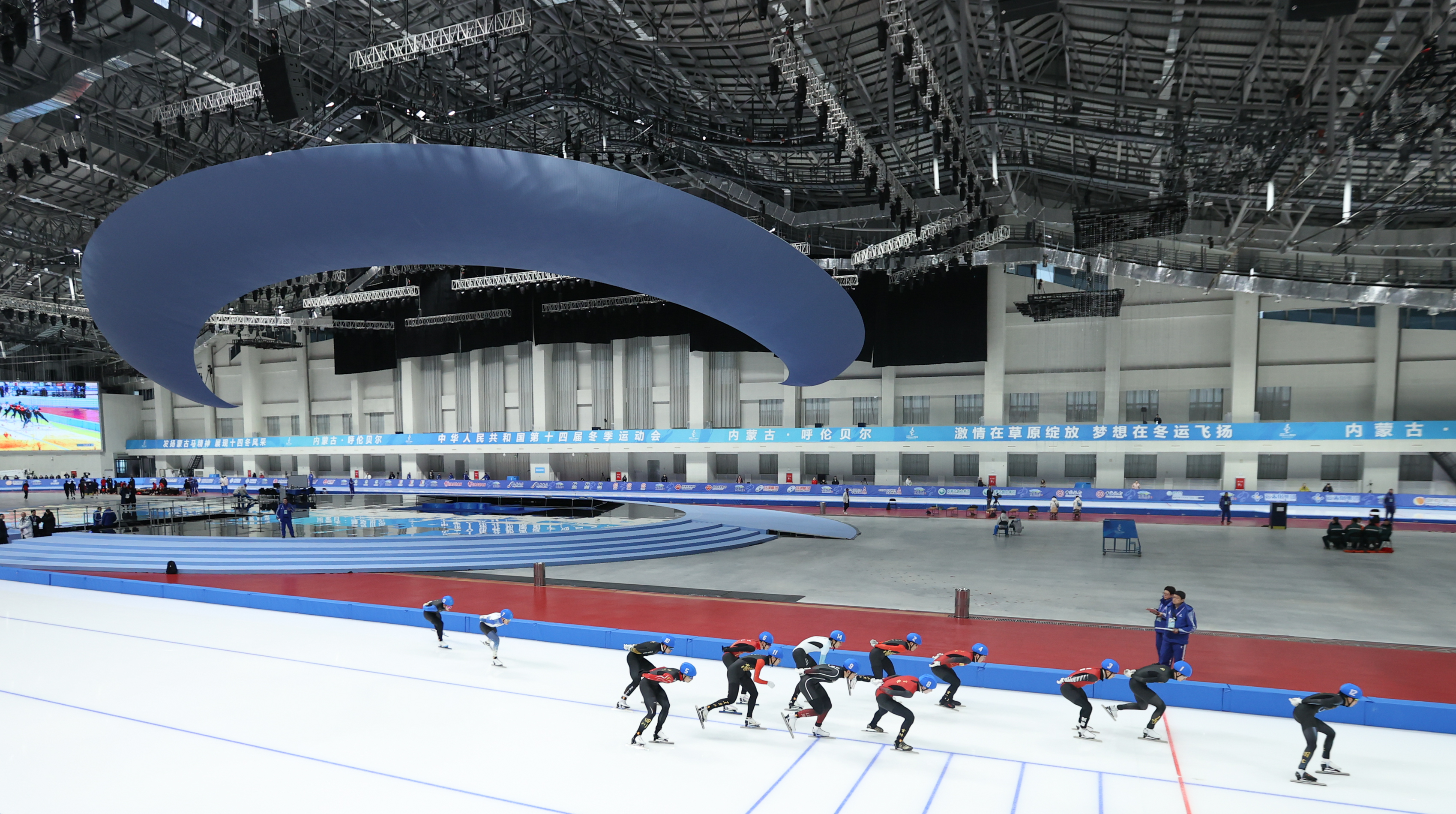 内蒙古冰上运动训练中心是组团式场馆群,包括速滑馆、短道速滑馆、冰球冰壶馆等,作为“十四冬”的主场馆,这里承担着开幕式和全部冰上项目比赛任务。