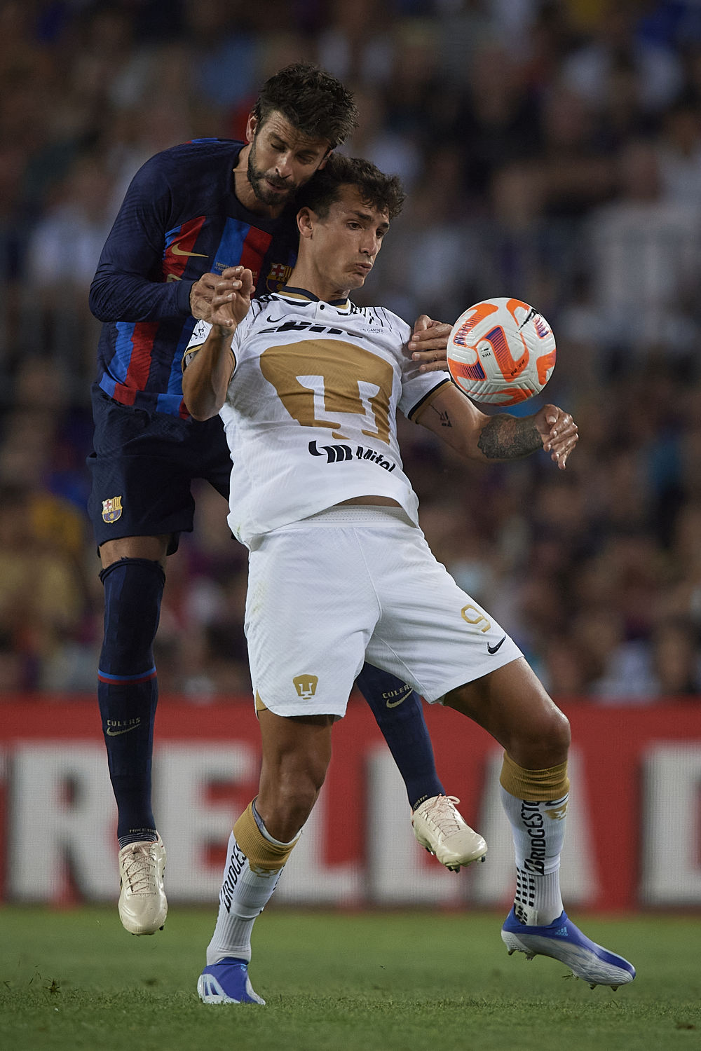 8月7日,巴塞罗那队球员皮克(后)与美洲狮队球员迪内诺在甘伯杯比赛中拼抢。新华社发(帕布罗·莫拉诺摄)