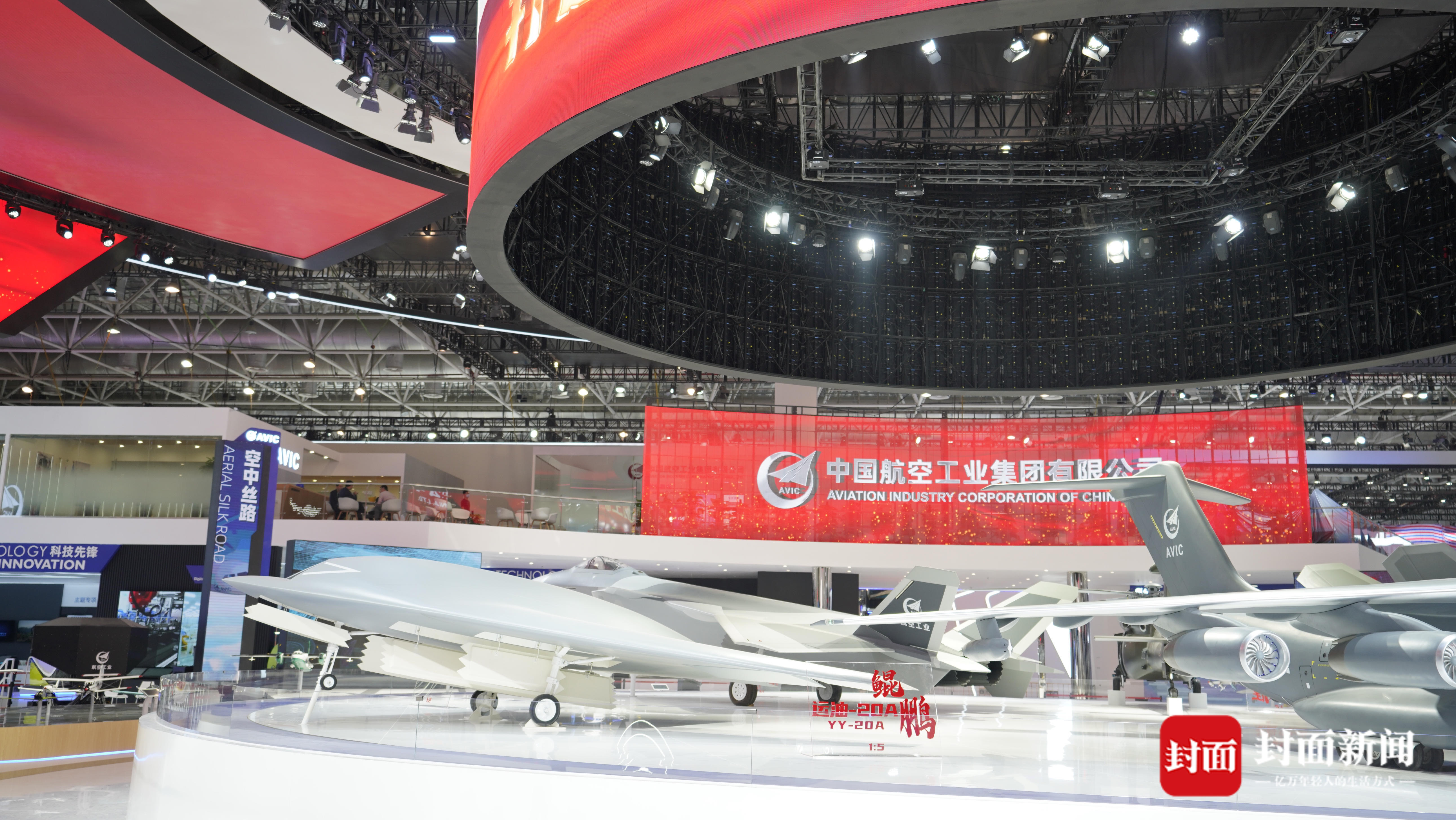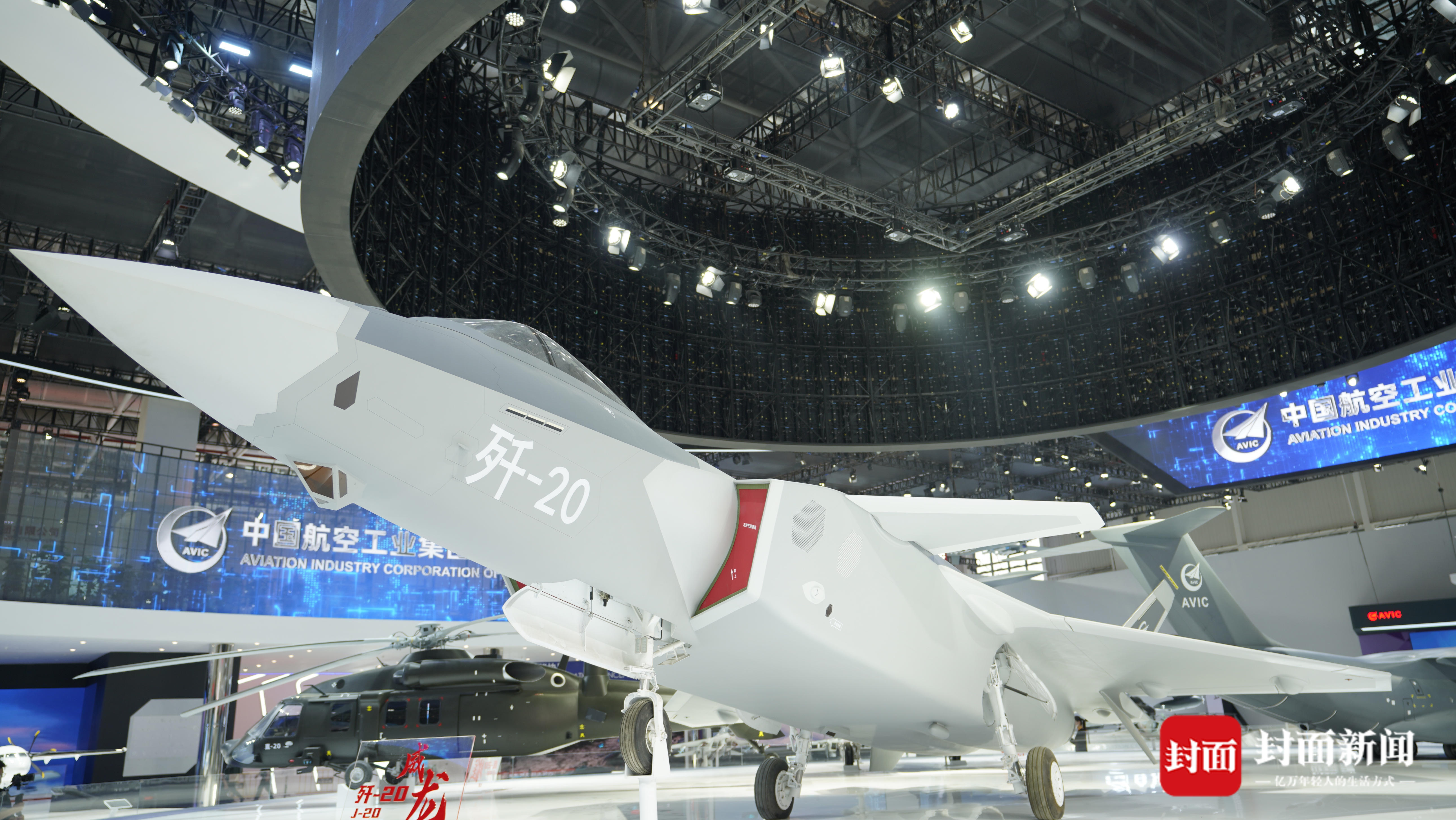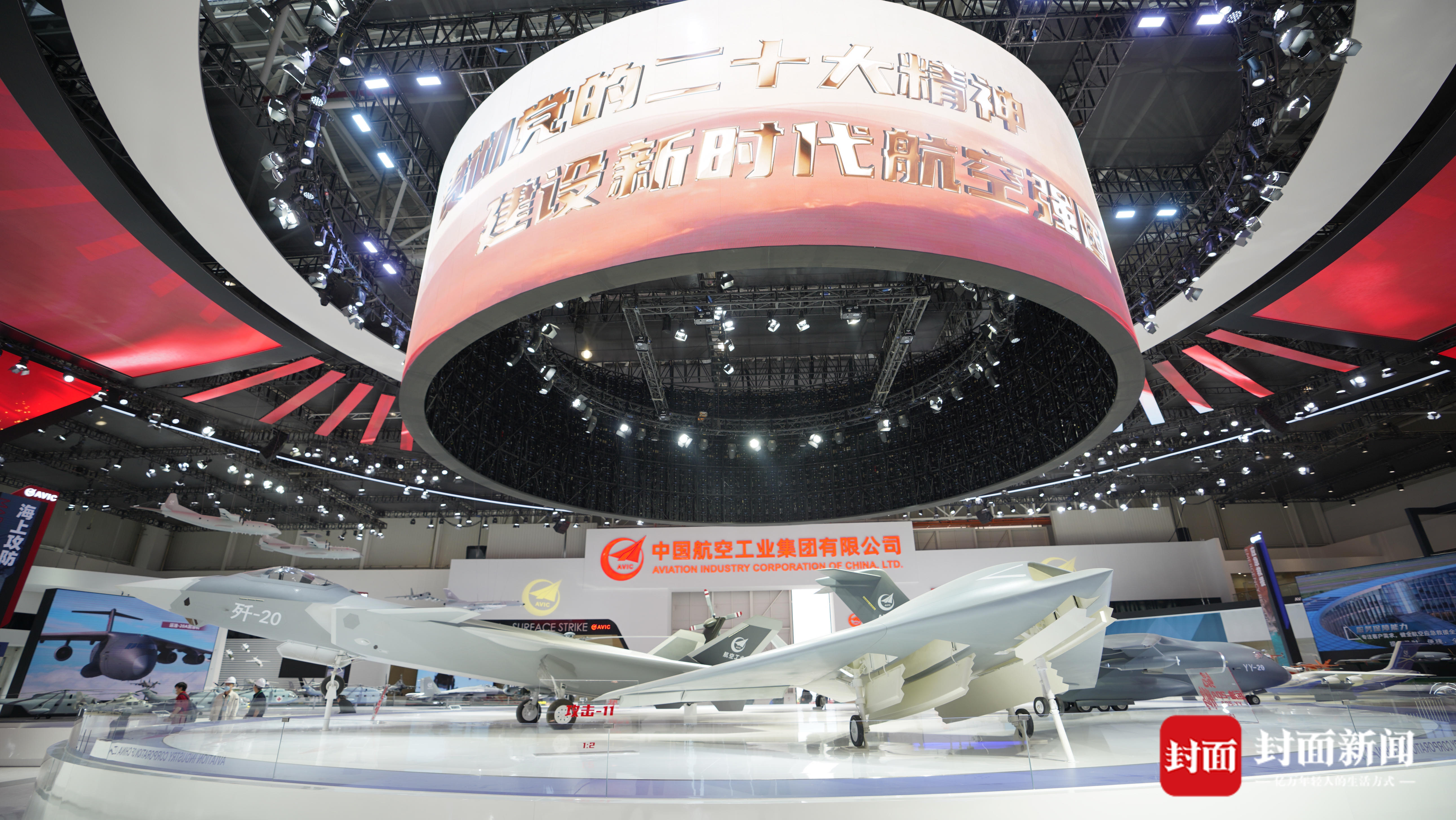 在馆内中心展台区域,“20系列”战机家族的杰出代表歼-20、运-20、直-20、攻击-11、鹘鹰五大明星机型,与展馆上方“飞翔之翼”主题造型相呼应,象征着40万航空人勠力同心、乘势而上,画出强国强军同心圆的使命和担当。