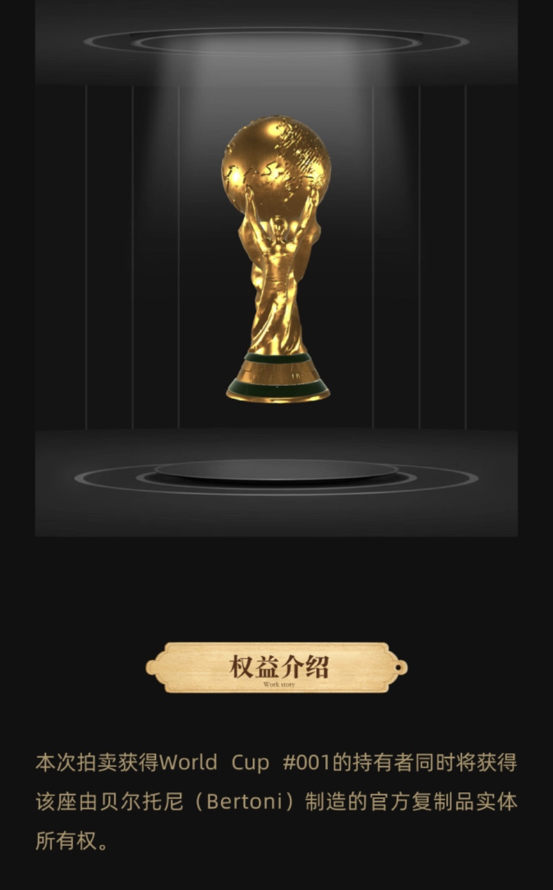 这座大力神杯将在11月9日12:00正式开拍,用户通过竞价方式参与,每次加价幅度为1万元,最终这座奖杯将现场交付给成功购得者。该用户还将获得送拍方星铱镧科技提供的“大力神杯”区块链数字藏品版权。