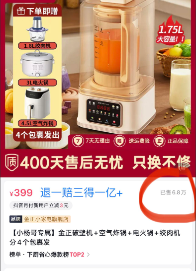 小杨哥带货的破壁机销量达6.8万。 网络截图