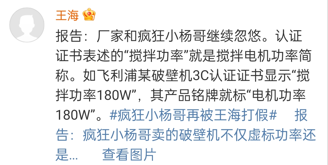 针对此回应声明,王海在评论区留言:报告:厂家和疯狂小杨哥继续忽悠。认证证书表述的“搅拌功率”就是搅拌电机功率简称。如飞利浦某破壁机3C认证证书显示“搅拌功率180W”,其产品铭牌就标“电机功率180W”。