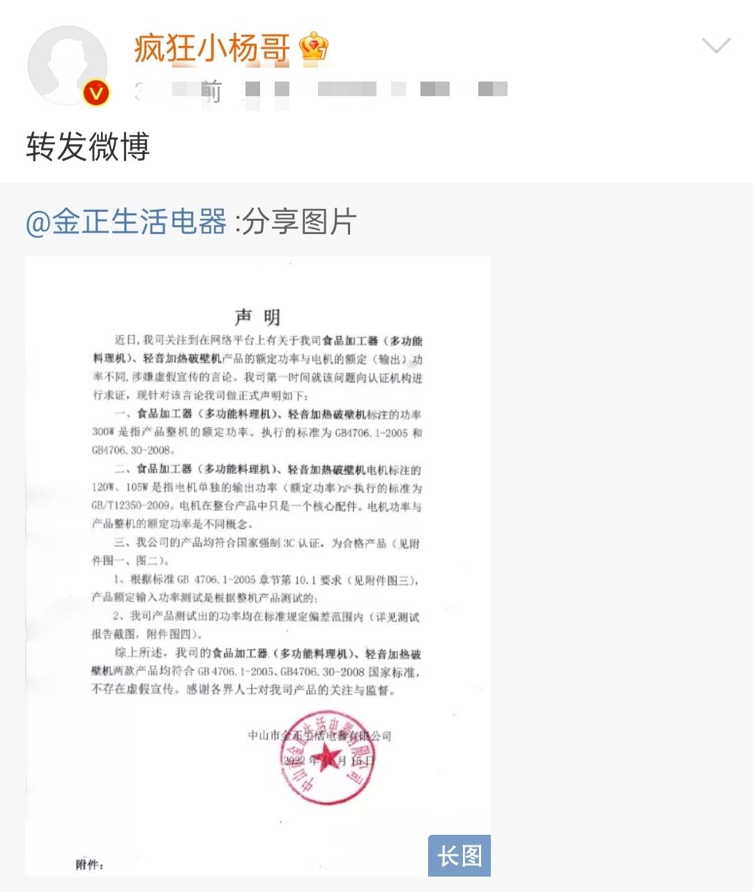 疯狂小杨哥转发破壁机商家回应声明