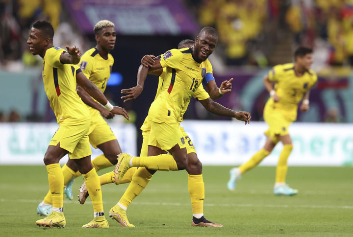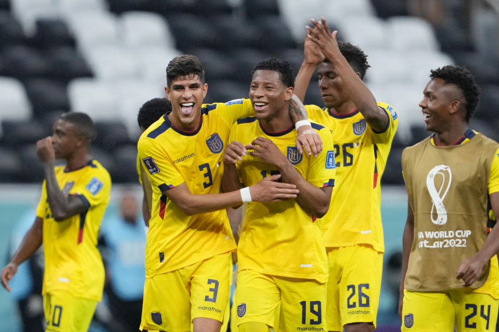 11月20日,厄瓜多尔队球员恩纳·瓦伦西亚(前右)在比赛中庆祝第二粒进球。 新华社记者 李明 摄