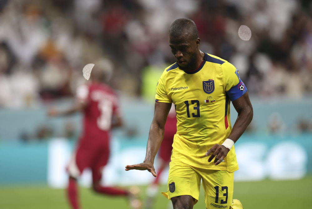 11月20日,厄瓜多尔队球员瓦伦西亚(左一)在比赛中头球破门,打进第二粒进球。新华社记者郑焕松摄