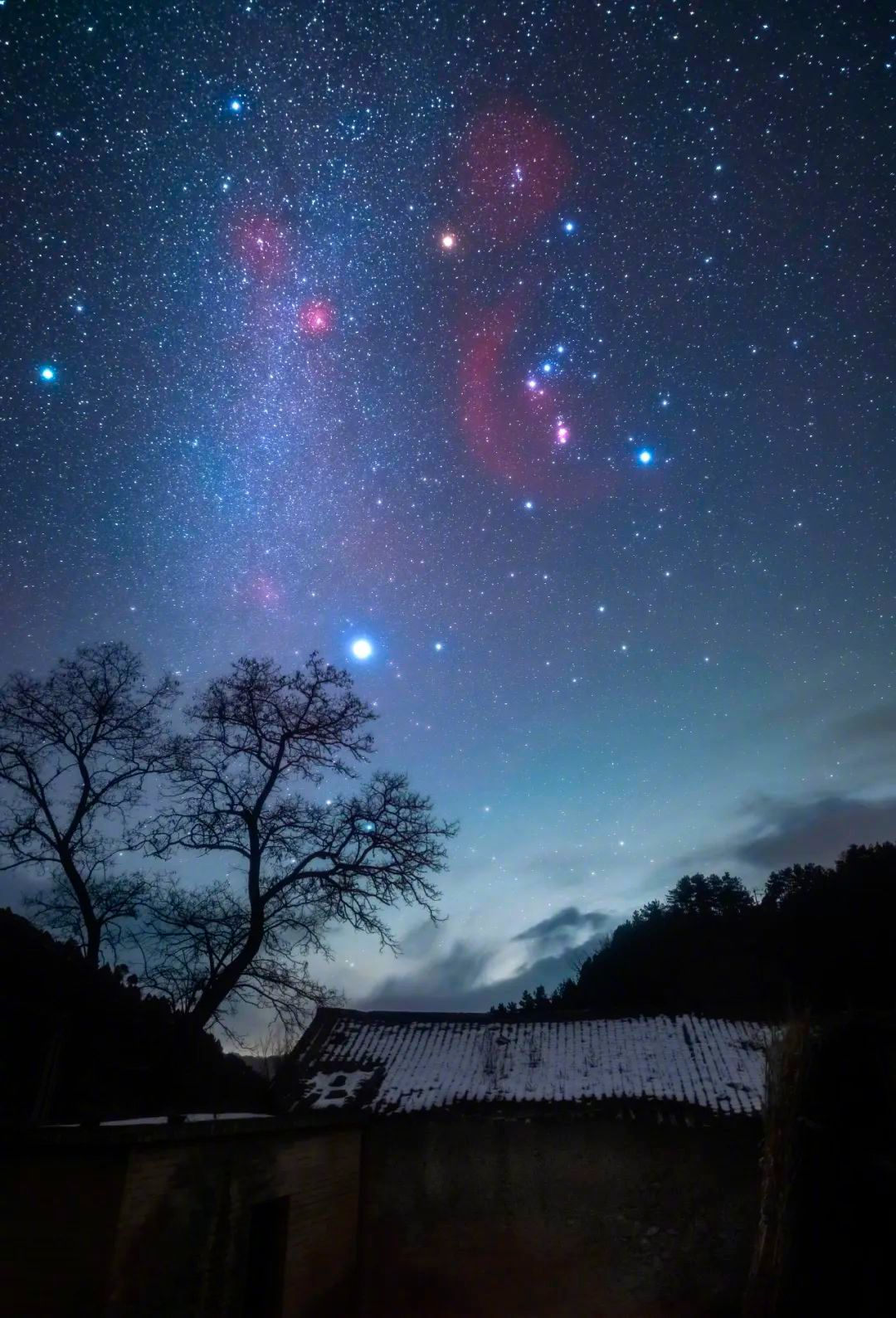 冬夜天空气象阔大,户外观星,北斗七星的斗柄所指,向北偏西,相当钟面10点钟方向。四边形的飞马座正临头顶,而冬夜星空标识的猎户座,已在东方地平线探头了。
