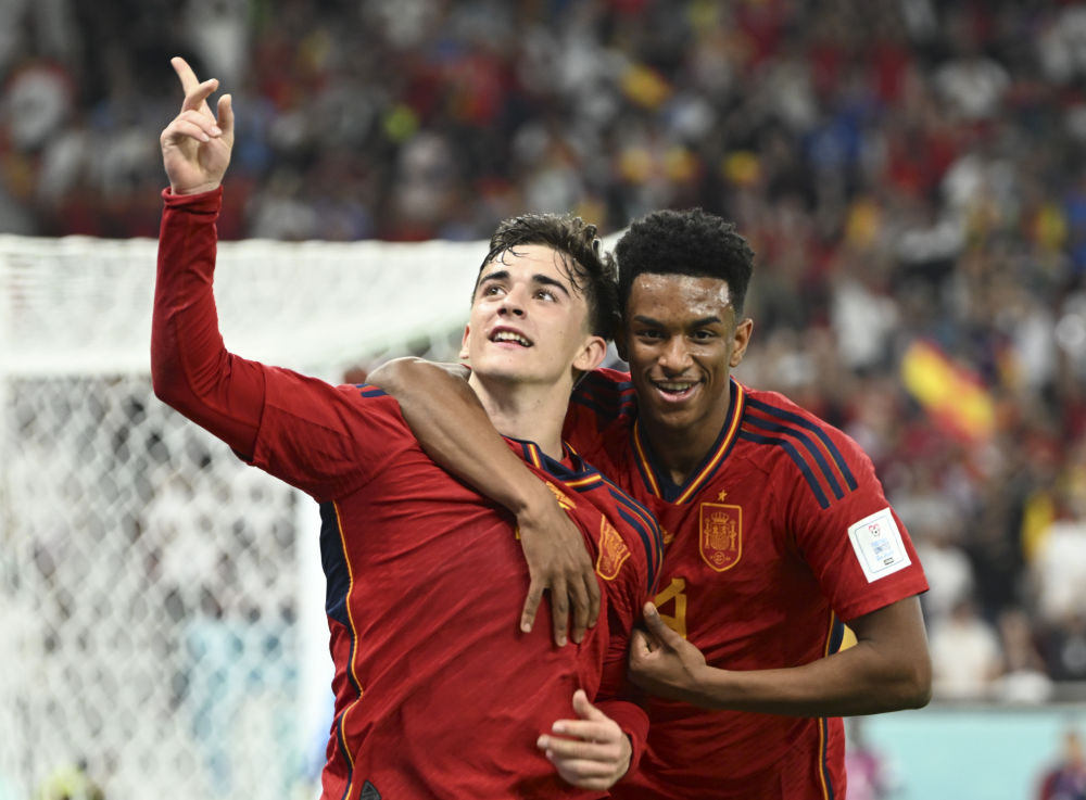 11月23日,西班牙队球员加维(左)在比赛进球后庆祝。新华社记者 李尕 摄