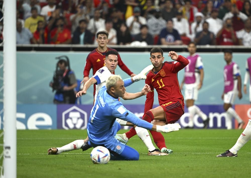 11月23日,西班牙队球员费兰·托雷斯(右一)在比赛中射门得分。新华社记者 李尕 摄