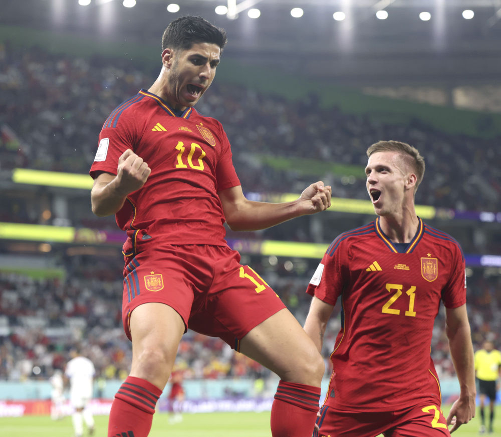 11月23日,西班牙队球员阿森西奥(左)在比赛中进球后庆祝。新华社记者 李明 摄
