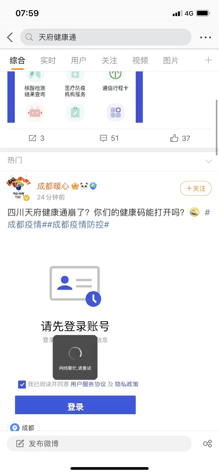 封面新闻记者从四川省大数据中心获悉,天府健康通由于流量过大,部分用户暂时出现登录困难,现正逐步恢复。目前故障正在排查处理中,请市民耐心等待。