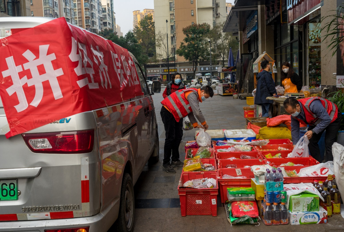 11月24日上午10点过,一辆满载果蔬粮油的面包车来到龙泉驿区驿都城二期楼下的卤菜店,“老板,你的菜到咯。”司机肖强从车上把一筐筐蔬菜搬下来,这些都是附近小区居民前一天在多多买菜下单购买的物资。