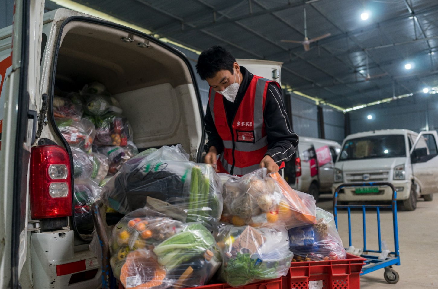 在龙泉驿区的一个多多买菜网格仓内,每天早晨5点半司机就到达了仓库,前一晚23点前消费者下单的物资已抵达,经过分拣装车之后,司机差不多在8点左右便出发前往各个团点送货。