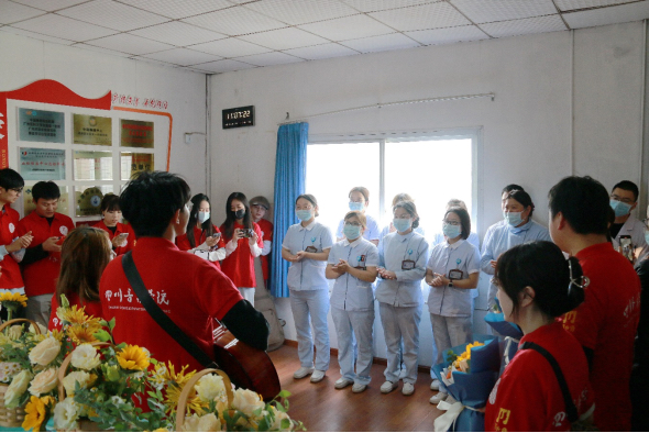 “在小小的花园里面,挖呀挖呀挖……”成都医学院第一附属医院与四川音乐学院流行音乐学院联合开展的庆祝护士节“快闪”秀活动。在儿科,志愿者选择了《花园种花》这个节奏欢快的歌曲作为第一个节目,病房护士、医生、志愿者、患儿和家长站在病房走廊上,一起感受优美旋律。在呼吸与危重症医学科,护士长冯晓丽说:“没想到今年还有这样的活动,感到满满的幸福感!”在骨科,护理部主任张坤表示:“以后可以多组织这种大家喜欢的形式,很有参与感。”