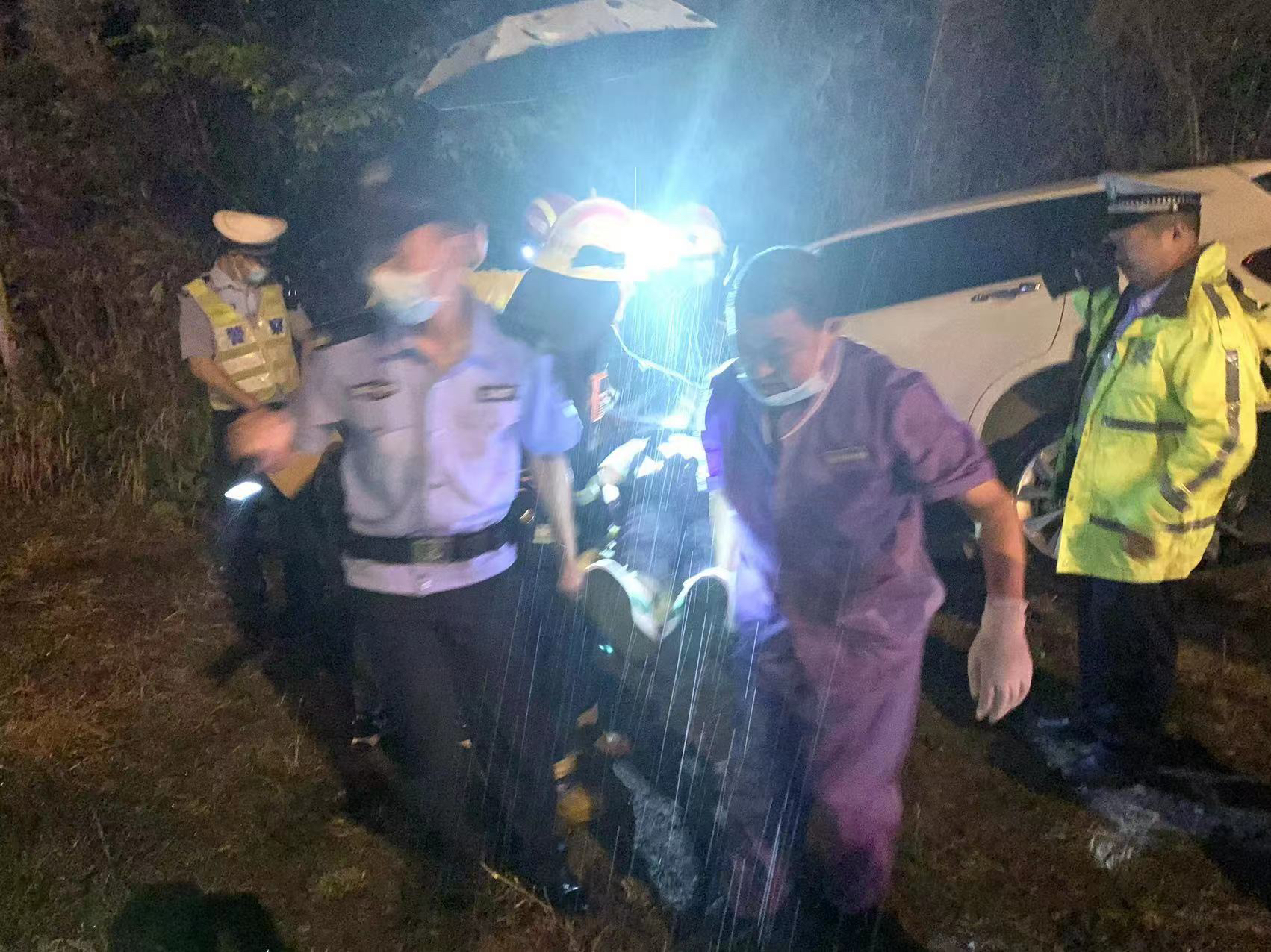 暴雨交加,狂风呼啸。由于雨势太大,警车雨刮器不停地刷着,宝墩派出所值班民辅警的心也被提到了嗓子眼儿,沿路搜寻失事车辆的踪迹。终于在成新蒲快速路一柴火鸡小院路边发现了一辆白色越野车,车头冲入了路边小沟内,经观察,该车车门反锁,车内驾驶员由于未系安全带,头部朝下,头歪斜着被卡在副驾驶脚垫位置;双脚朝上蹬在驾驶室座位上。由于驾驶员头部被卡,怕造成二次伤害,宝墩所民警高远明立即拨打了120、119急救电话,等待专业救援。