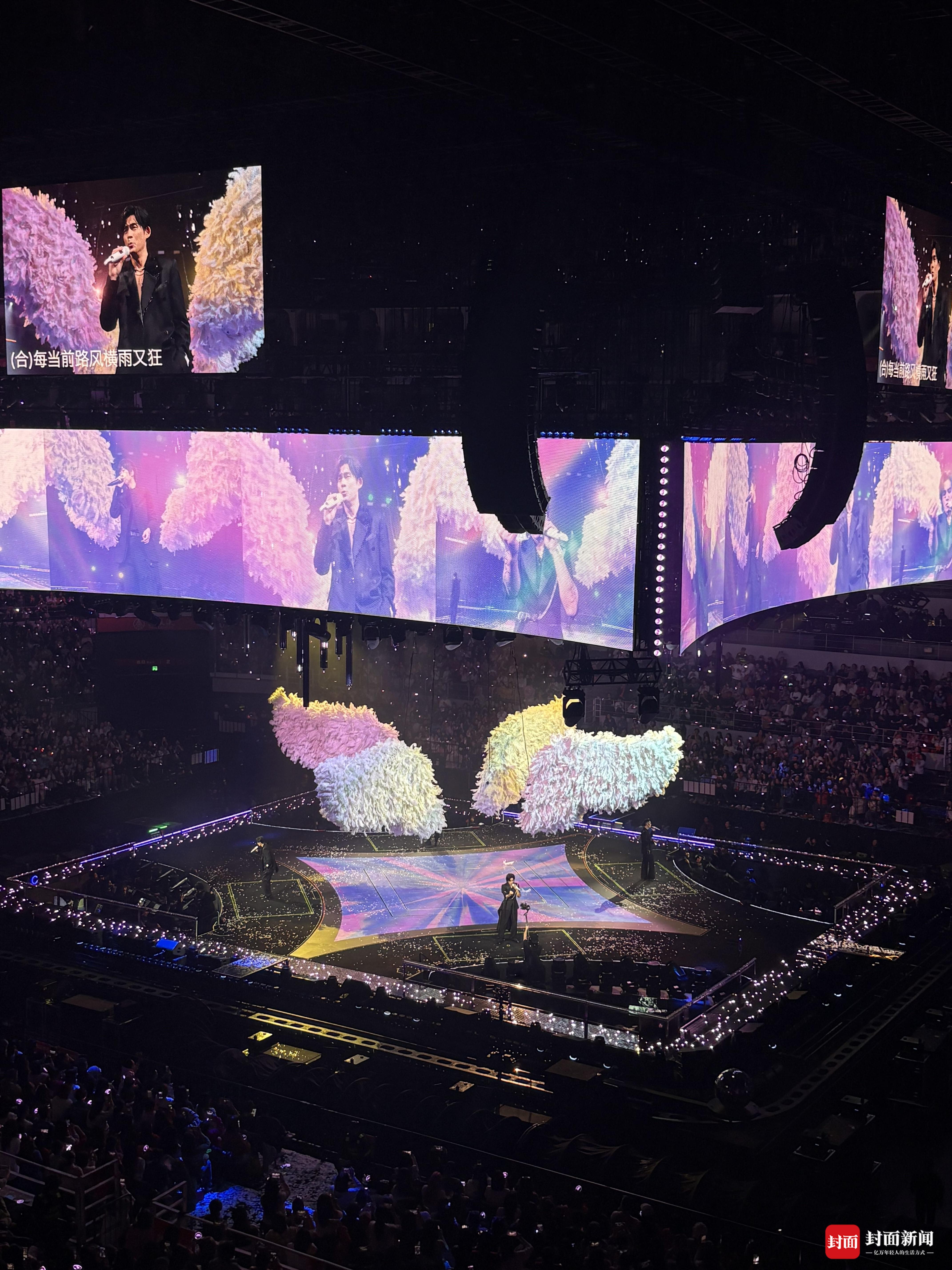 本次演唱会采用四面舞台设计,视觉体验非常契合四人组合演唱。尤其在合唱环节,四人登上专属升降装置绕场而行,与各个区域的观众近距离互动,令人印象深刻。《流星雨》大合唱环节,“流星雨”特效降临,无数光点从舞台洒向观众席,犹如星河倾泻,配合歌曲节奏闪烁、流动,全场仿佛置身于一片浪漫的星空之下。此外,绚烂的彩色翅膀、璀璨的城市光影等视觉元素交替出现,打造出一座真正“恒星之城”,为每个人的青春献上了最美的梦境。