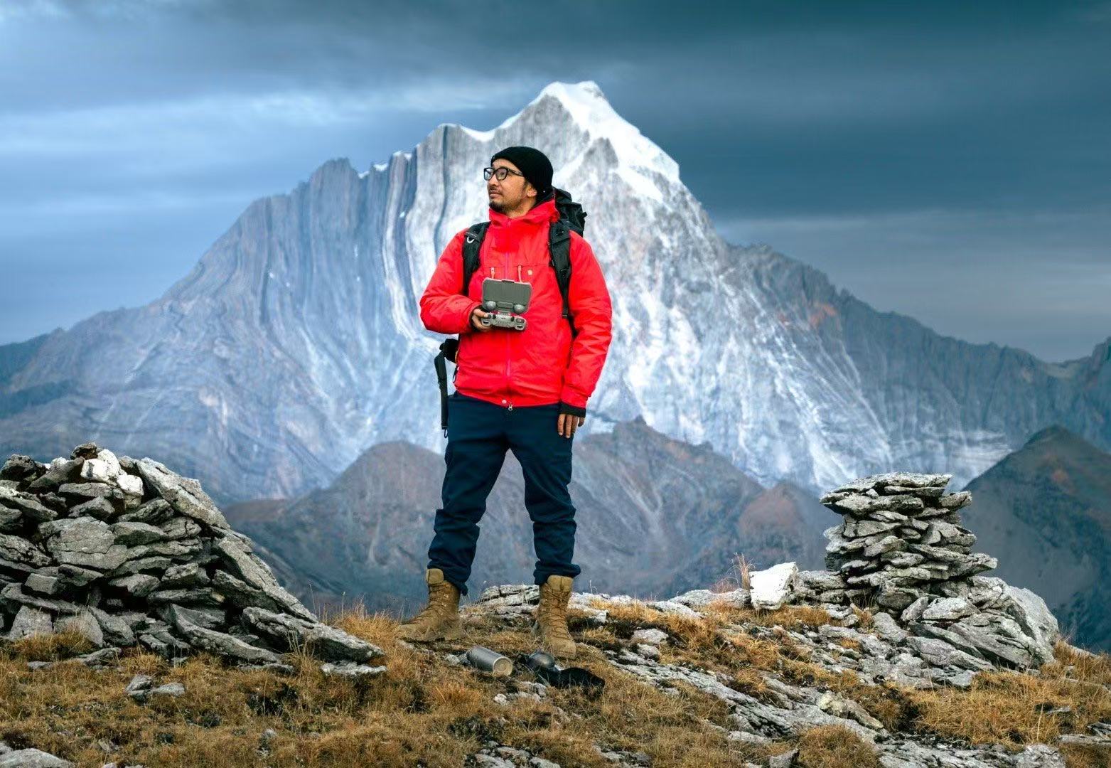 高海拔地区摄影,体能消耗大、设备耗电快是主要问题。“如果是攀登海拔超过4800米的高山,应尽量简化装备。一般我就带一台航拍无人机,海拔6000米以上都能稳定工作。如果想从第一人称视角记录登山过程,户外运动相机是不错的选择,小巧轻便,还有防水防冻等特性,夹在帽子上或者胸前均可。低温环境下,建议将设备的电池贴身存放,以保持温度,避免因低温导致电量快速耗尽。”