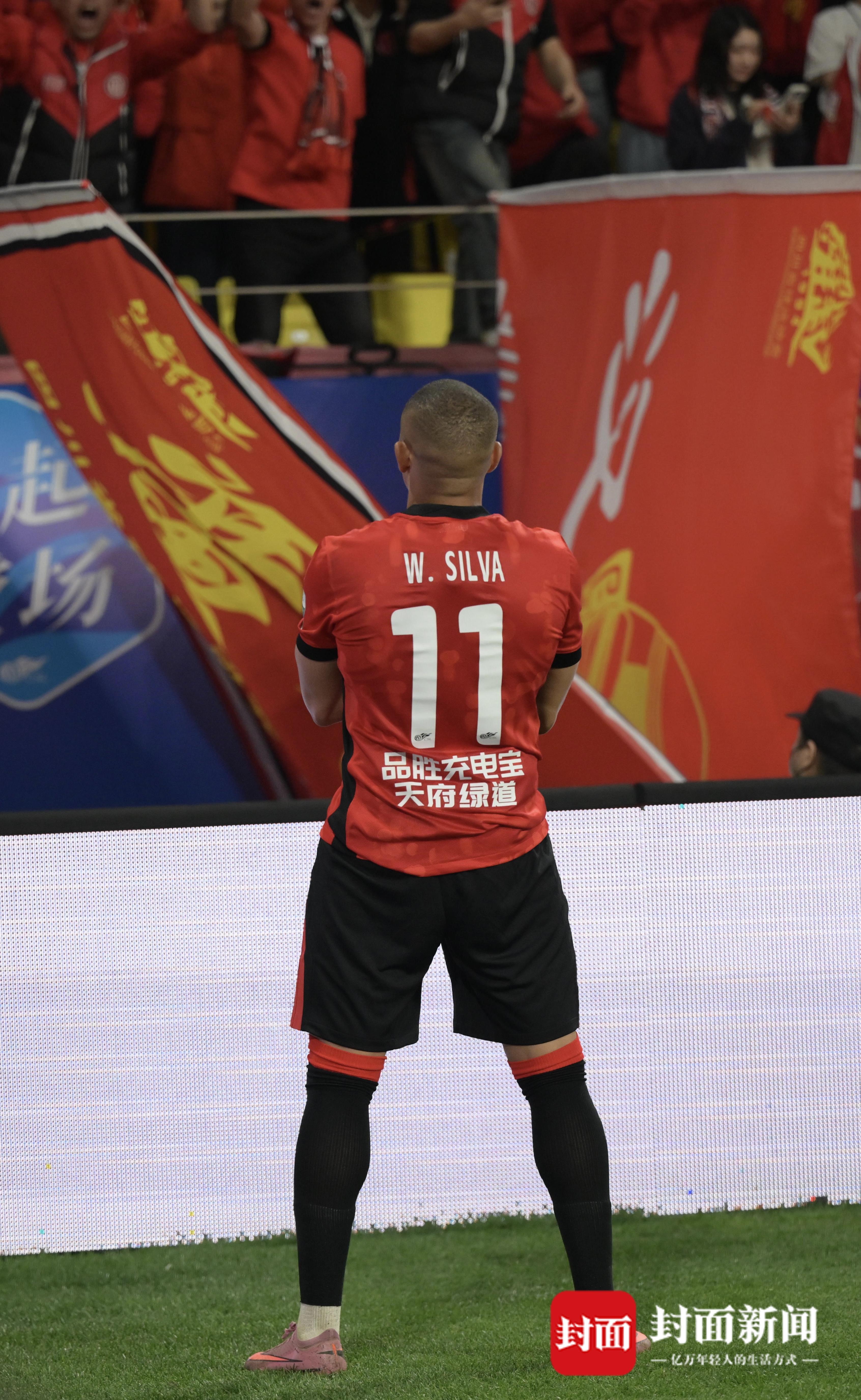 多打一人,场上的局势瞬间发生逆转,成都蓉城逐渐掌握了场上主动。第20分钟,蓉城前场打出精彩配合,费利佩禁区内接球后回做给席尔瓦,席尔瓦凌空推射进球,将比分扳成1-1!这是席尔瓦加盟蓉城后的首粒进球,进球后的他也特别兴奋,面向球迷看台怒吼庆祝。球迷们也齐声喊道“姆巴佩”,对这位长相酷似法国球星姆巴佩的球员表达喜欢之情。值得一提的是,曾经蓉城的“巴西连线”仅仅只有罗慕洛和费利佩,席尔瓦的加盟让巴西连线增加了更多的攻击点,可以预见,这将是本赛季蓉城重要的攻击线之一。
