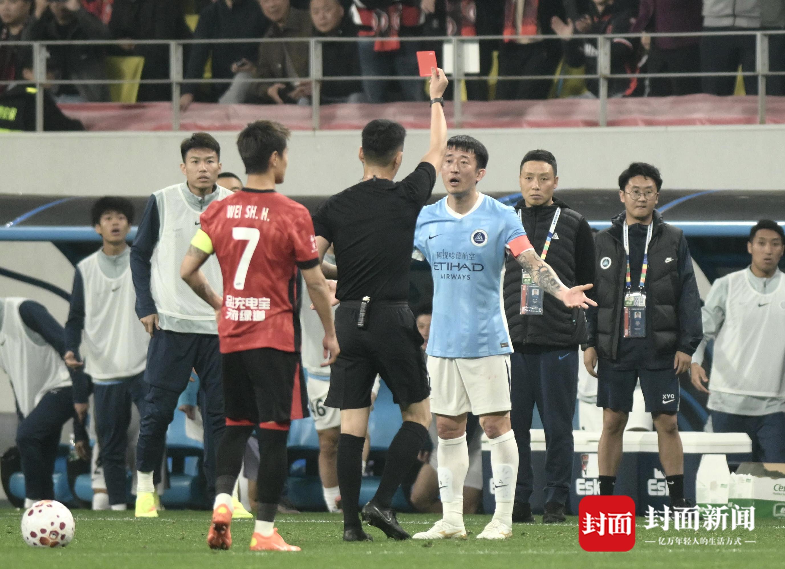 上半场比赛,深圳新鹏城先发制人,开场第5分钟,阿代米接到夏合扎提传球晃过两名蓉城后卫后推射破网,客场作战的新鹏城1-0领先。落后的成都蓉城并不慌乱,依然按照自己节奏稳扎稳打。比赛在第18分钟出现戏剧性转折,姜至鹏在抢球时肘击席尔瓦,席尔瓦被打得满嘴是血。裁判先是判罚了黄牌,观看VAR后改判红牌将姜至鹏罚下。