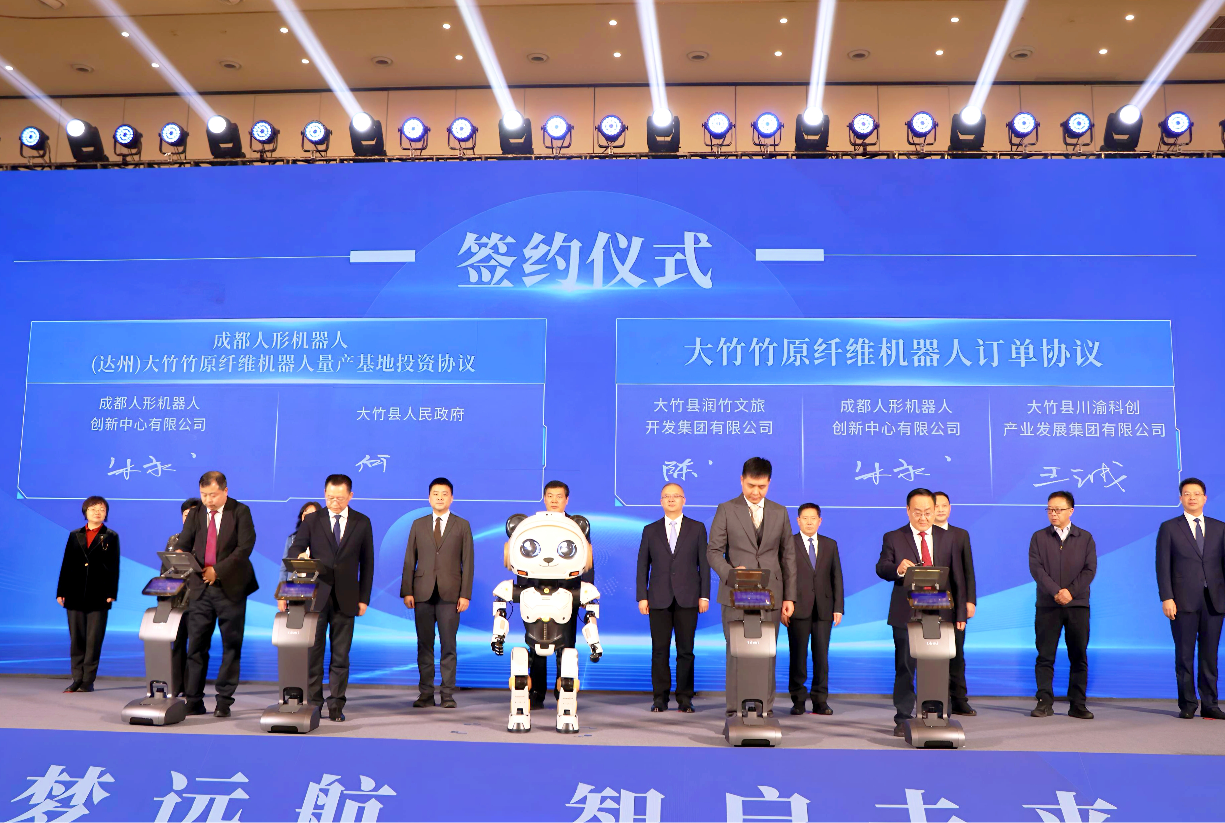 项目签约仪式备受关注。现场,成都人形机器人创新中心与大竹县相关单位现场签署两项关键协议——《成都人形机器人(达州)大竹竹原纤维机器人量产基地投资协议》与《大竹竹原纤维机器人订单协议》,标志着总投资3亿元的合作项目正式进入实施阶段。