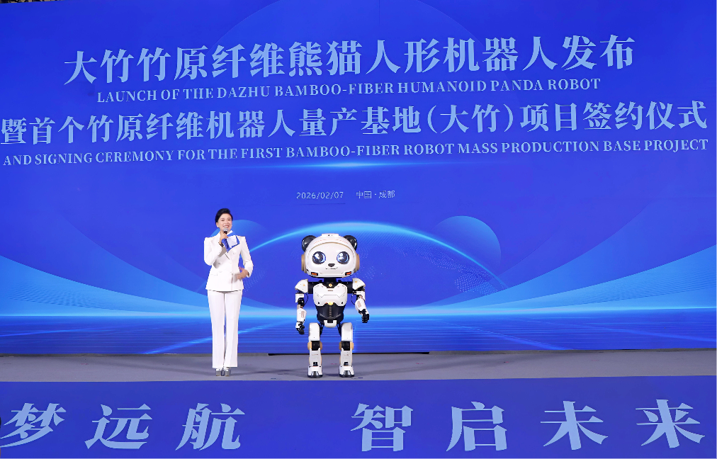 2月7日,大竹竹原纤维熊猫人形机器人发布暨首个竹原纤维机器人量产基地(大竹)项目签约仪式在成都举行。