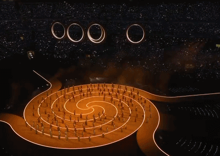 最终,舞者从圆环中飞出,落向地面。走出自己的圆环,寓意推动更多的圆环通达汇聚。奥林匹克五环灿然而生。